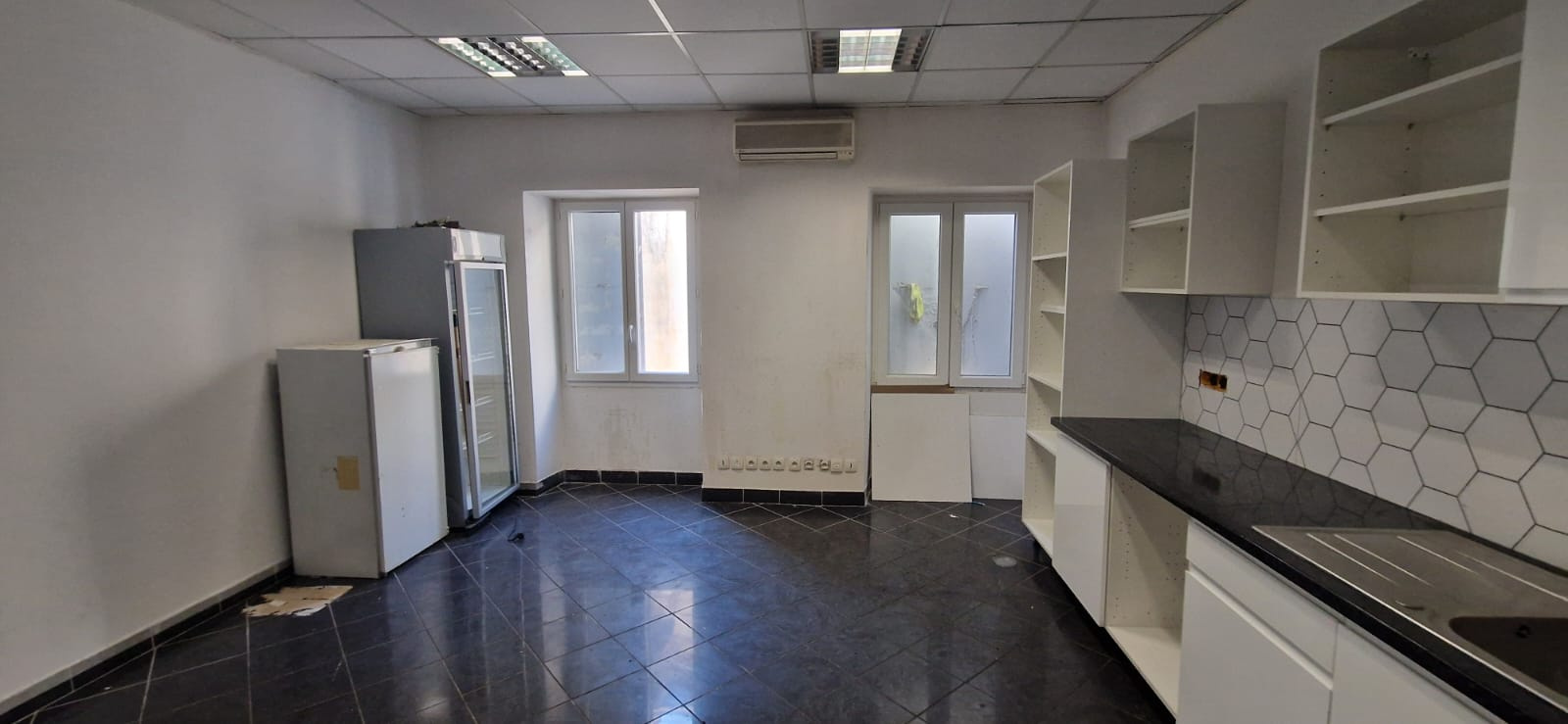 Marseille 2ème : à 1 mins à pied de la place de le Joliette (rue Mazenod), local commercial d'environ 100 m2 avec 2 vitrines, 2 wC, anciennement exploité en pâtisserie traiteur. Possibilité nombreuses activités sauf cuisson sur palce car pas d'extraction. Idéal burreaux activités de services kiné, sport, centre médical, agence immobilière...